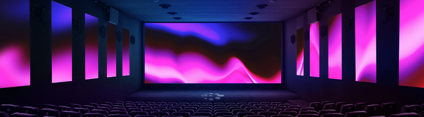 Les panneaux lumino-textiles placés de chaque côté de la salle offrent une sensation d’immersion et créent une atmosphère visuelle spectaculaire grâce aux couleurs et aux formes dynamiques qu’ils diffusent. Ils permettent d’élargir l’horizon d’un paysage ou de renforcer la chaleur d’une explosion, de façon subtile et élégante. Les panneaux LEDS reflètent la vision périphérique de l’œil humain et permettent de rester concentré sur le grand écran pour une plus grande immersion dans le film.